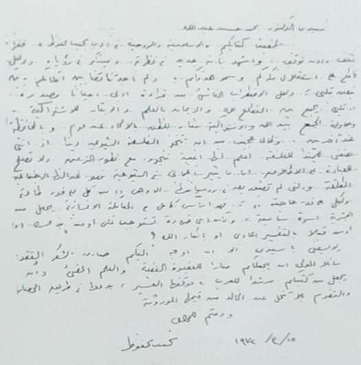 4- حين نشرت الطبعة الأولى أرسلت إلى نجيب محفوظ بنسخة مهداه بخطي ، ومعها أربع نسخ أخرى على عنوانه بالأهرام ، فلم يمض وقت طويل حتى جاءتني منه رسالة خطية ( من حقي أن أعتز بها ) وهي التي أرفق صورتها أعقاب هذه الكلام ، وفي رسالته تلك يحدد رؤيته الحضارية ، ويمكننا أن نكتشف أنها ذات الرؤية التي عرض لها في رواية ” قلب الليل ” التي كتبها بعد تاريخ هذه الرسالة بعدة سنوات .
