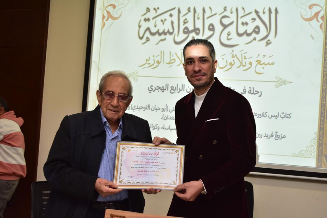 وفي كلمته، أكد الإعلامي ضياء الدين حامد أن «الإمتاع والمؤانسة» يمثل نموذجًا فريدًا لكتب التراث العربي في القرن الرابع الهجري، حيث حوّل التوحيدي السمر والمجالسة إلى معرفة، وجعل من المجالس مرآة للعقل والفكر، مشيرًا إلى أن الكتاب يُعد سجلًا حيًا للفكر والسياسة والدين في تلك المرحلة، وليس مجرد عمل توثيقي.