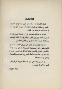 هذا الكتاب فريد في موضوعه ومحتواه، وخلاصة موضوعه في إجابة سؤال مفترض عن عدم معرفة العرب (القدماء) بفن المسرح ، وسؤال آخر : لماذا لم تترجم نصوص ونظريات المسرح الإغريقي حين نشط العرب والمسلمون في ترجمة الفلسفة اليونانية ؟