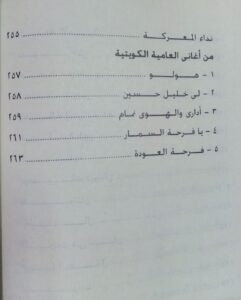 تقوم مادة هذا الكتاب على اختيار خمسين قصيدة ، سجلت بنصها الكامل ، وخمس أغنيات شعبية مما غناه المطربون الكويتيون والعرب ، وفي صدارتهم ( ام كلثوم ، وعبد الحليم حافظ ، وصباح ) فضلا عن المطربين الخليجيين .